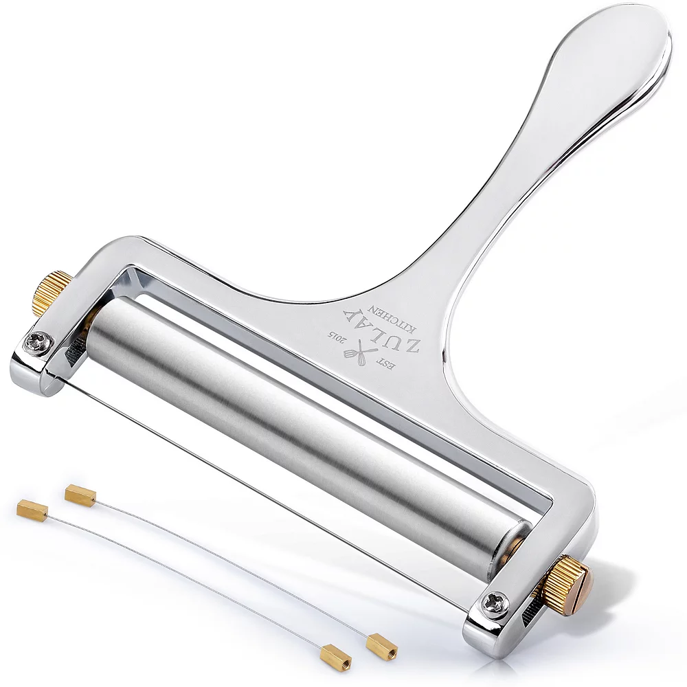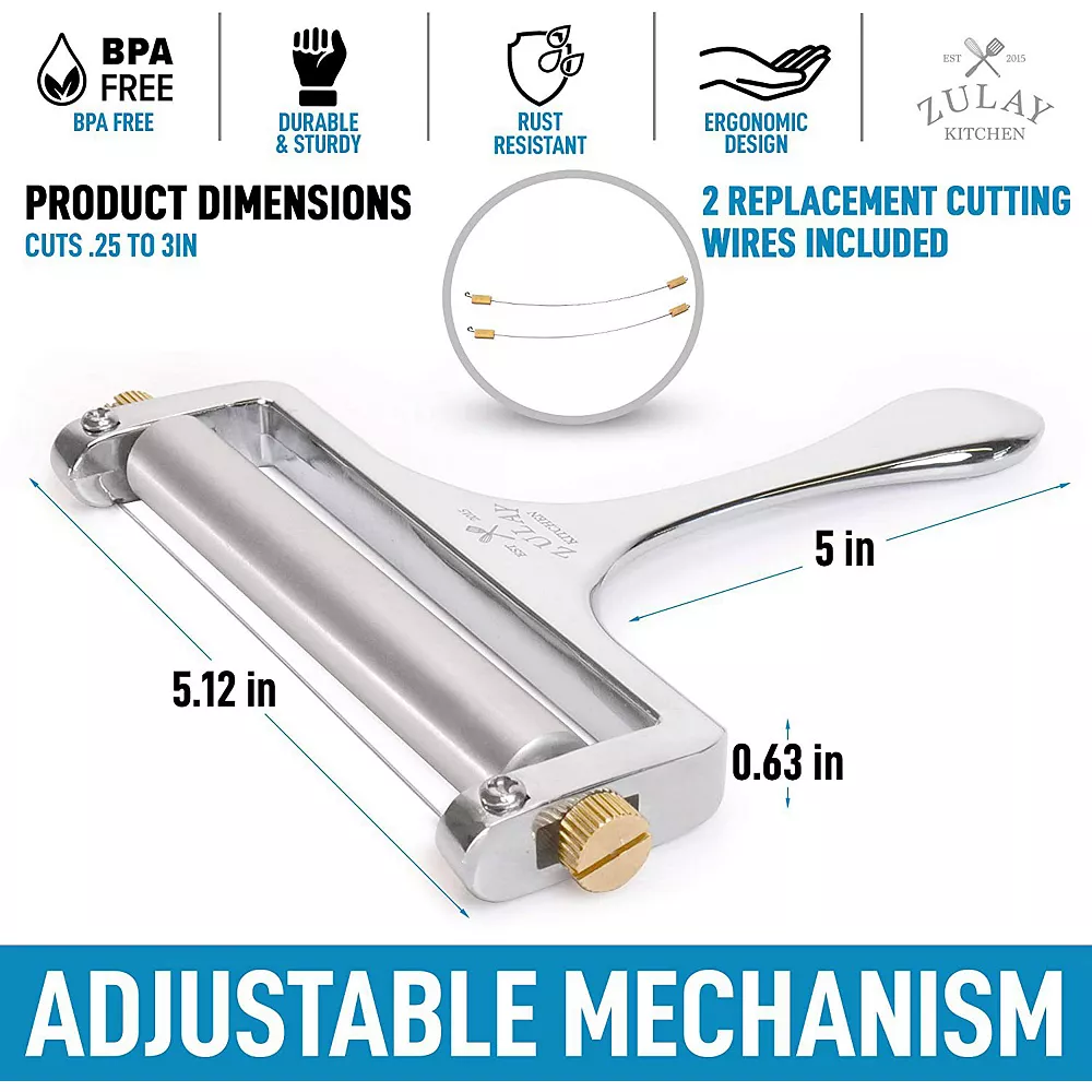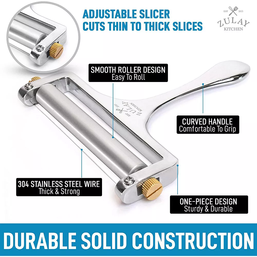 This high-quality wire cheese slicer is made with a zinc-aluminum alloy that provides a strong, comfortable handle. The 304 stainless steel cutting wire cuts hard cheeses like Swiss, and cheddar like butter. Now you can easily cut your favorite cheese in a matter of seconds.