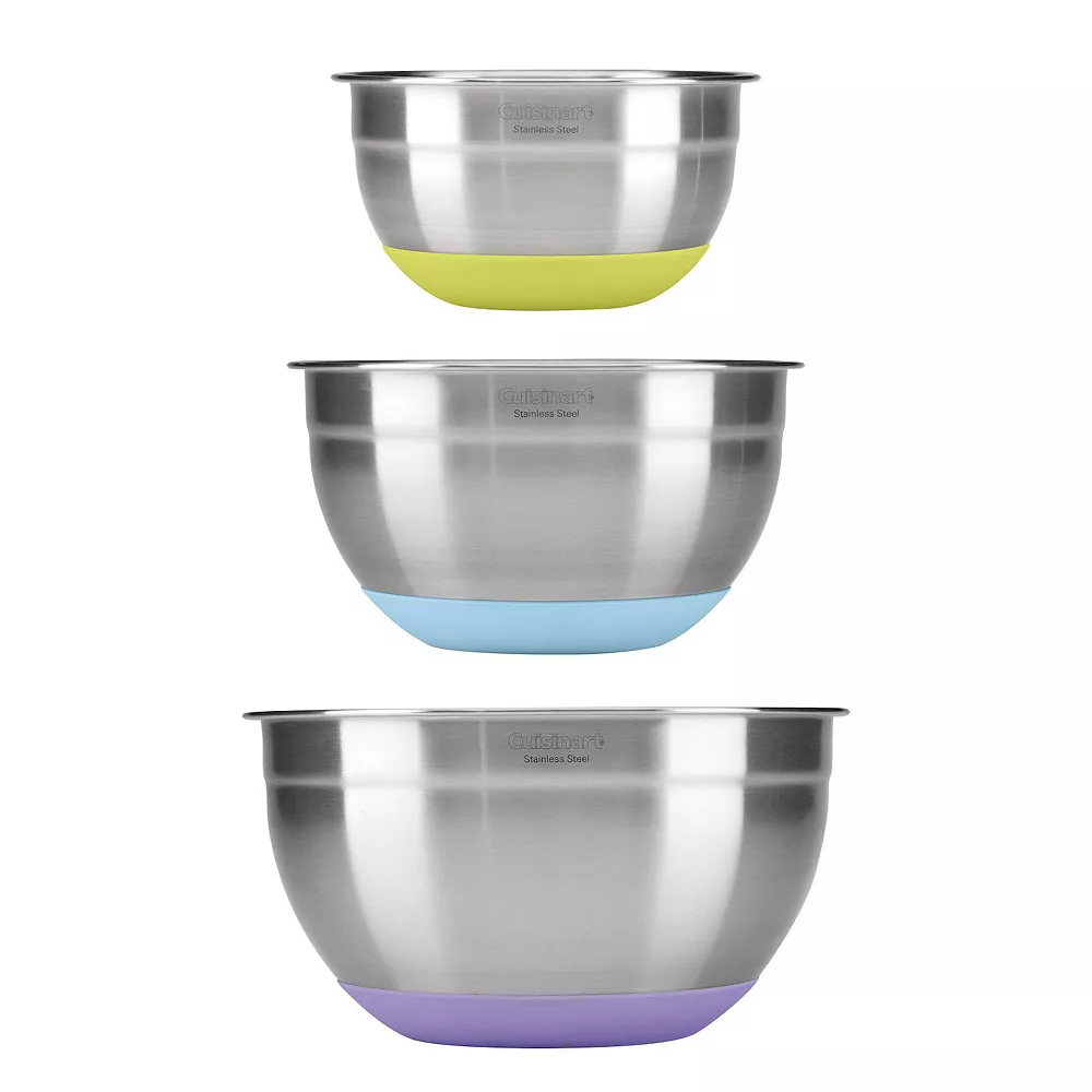 Constructed of durable and stylish stainless steel, each mixing bowl in this Cuisinart 3-piece set features a nonslip silicone base that keeps it stable as you mix your favorite culinary creations.