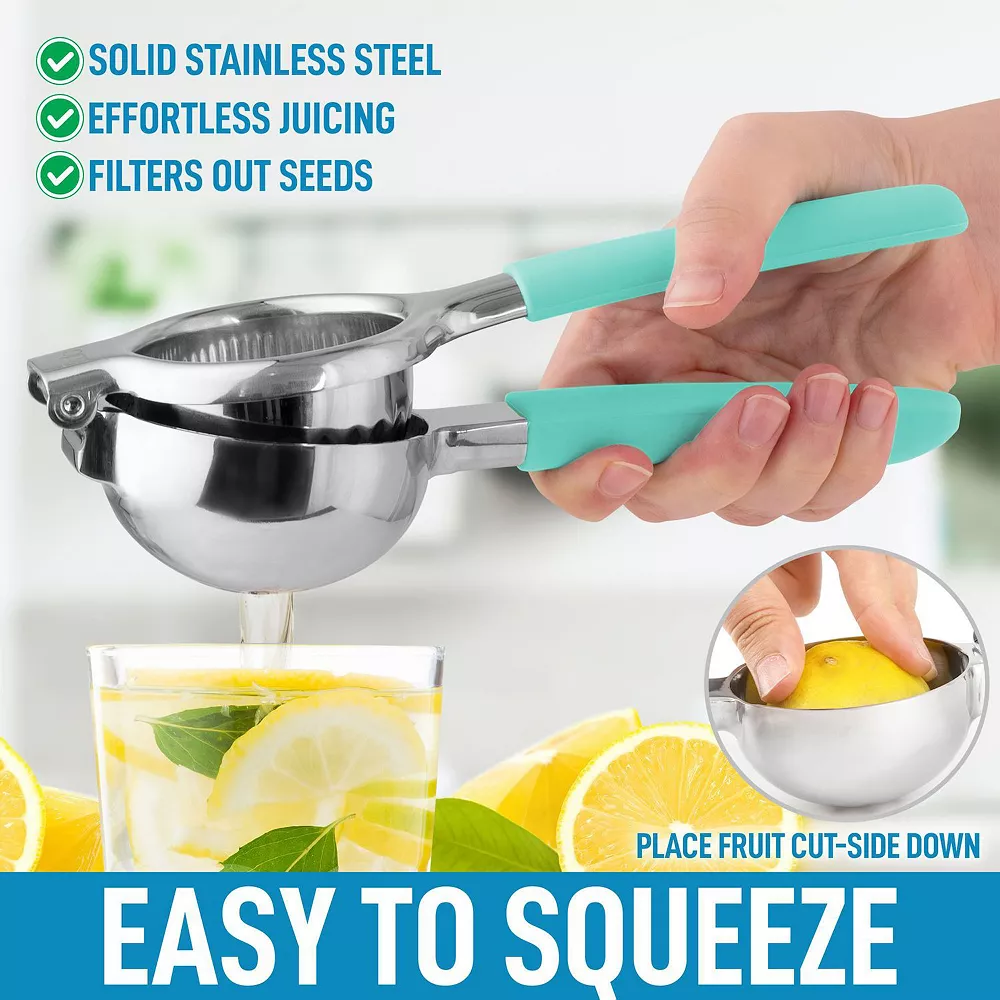 Our premium citrus press is made with ultra-strong high quality 18/8 STAINLESS steel, with the perfect metal composition for no corrosion or rusting and unbreakable tank status. You also will have NO SEEDS in your juice. Works perfectly on Meyer lemons, Key limes, limequats, Mexican limes, Eureka or Lisbon lemons, Rangpur or Tahiti limes, from Florida, California or Abroad our citrus juicer tool can squeeze them all with maximum result.