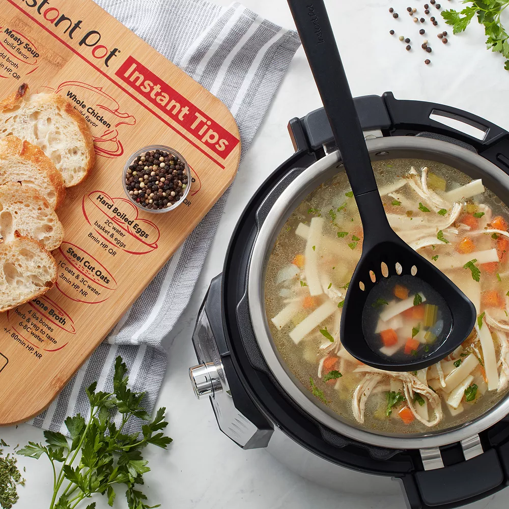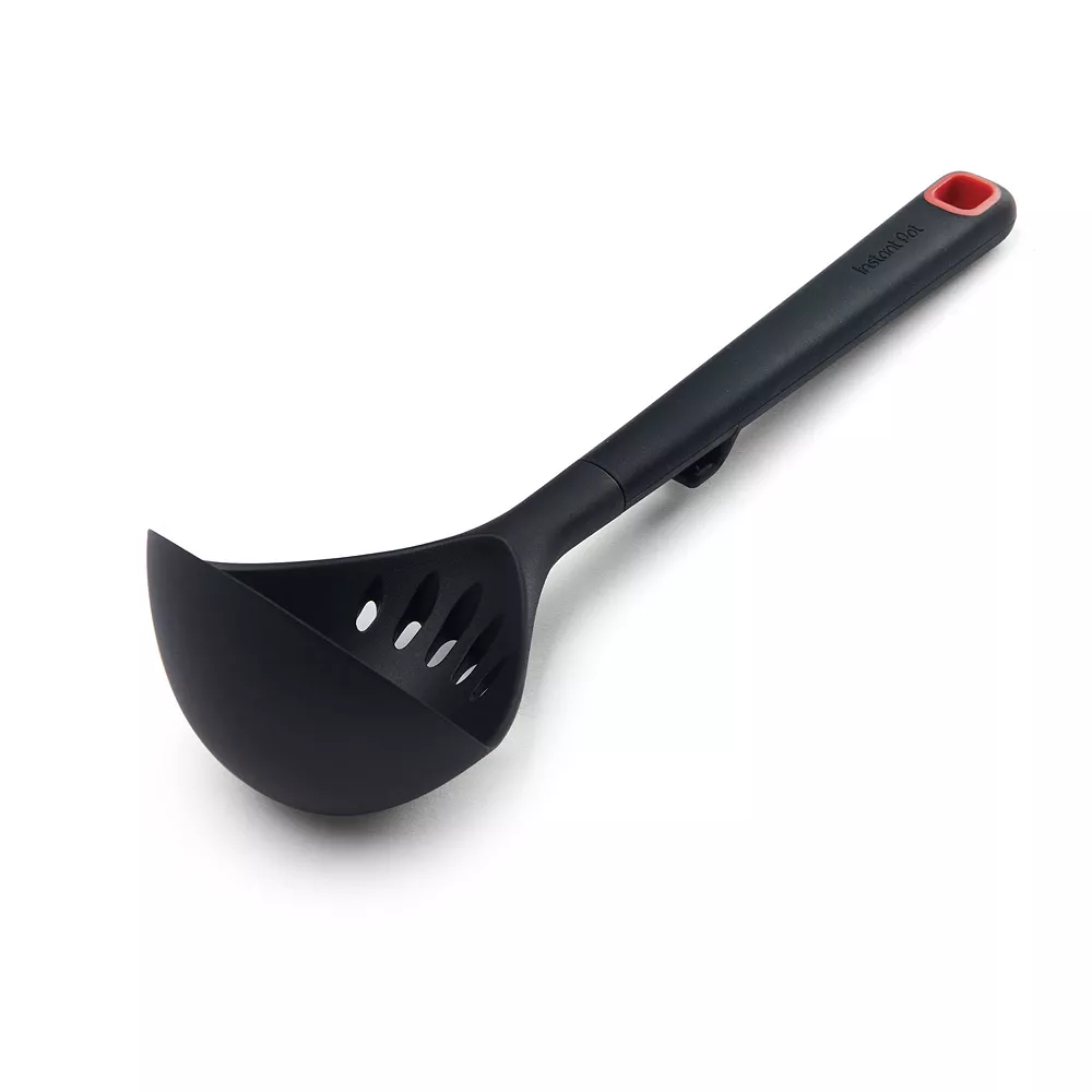 This Ladle is an Instant Pot pressure cooker essential accessory. Its perforated head helps you ladle and strain with one simple tool, and its silicone non-slip handle features a latch to rest the ladle on the pot while cooking.
