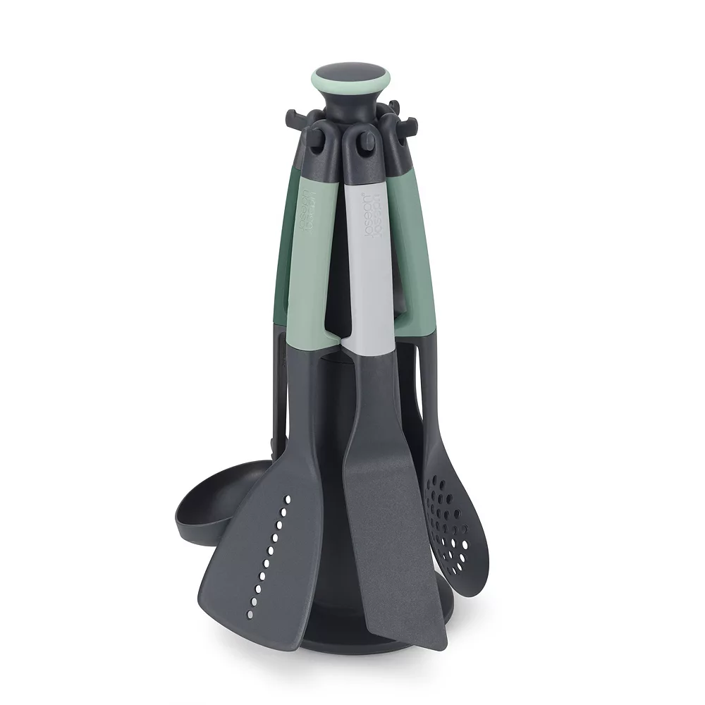 The Joseph Joseph Elevate range of kitchen tools is designed to minimize the mess of cooking by placing utensils onto kitchen surfaces during use. Each tool has a weighted handle with an integrated tool rest that prevents the tool head from touching the work surface when placed down.