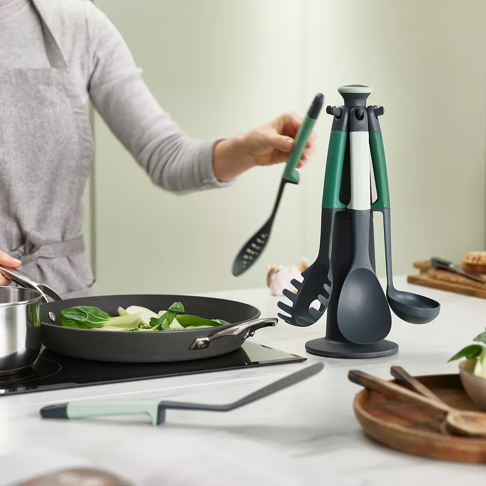 - Solid spoon, slotted spoon, flexible turner, slotted turner, ladle, spaghetti server & rotating storage stand