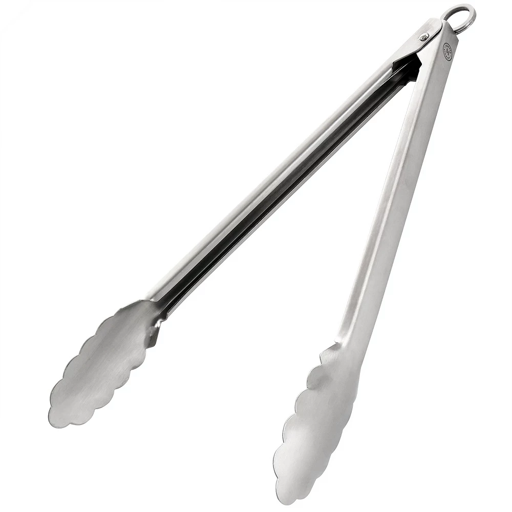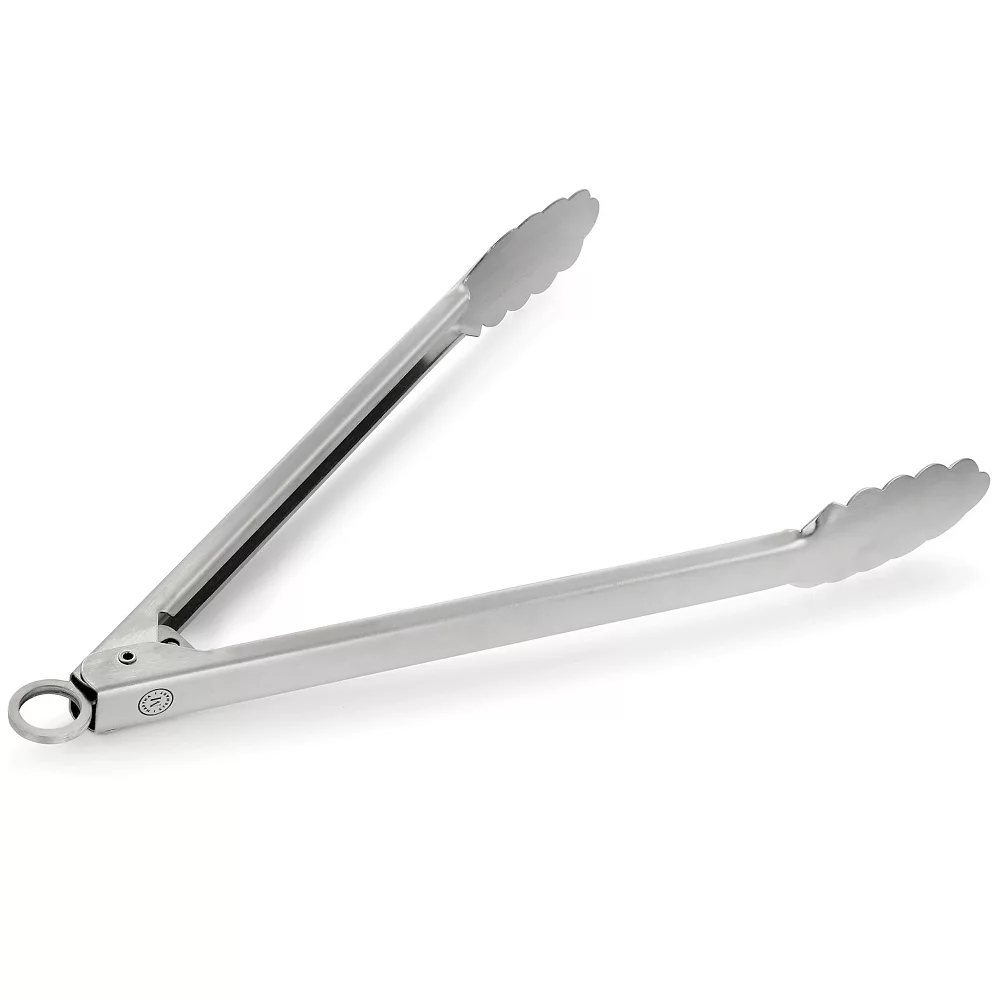 Enjoy cooking or serving your favorite meals with these Martha Stewart stainless steal tongs. Constructed with quality brushed stainless steel, these tongs are strong and durable and make cooking a breeze. Use to rotate, adjust, and grab food items with ease. Extra long 12in handle makes cooking in large pots easy and keeps your hands away from heat for added safety. Scalloped heads and spring design create a solid grip when clamping. Easy-lock mechanism with hanging loop for convenient and compact storage. Dishwasher Safe.