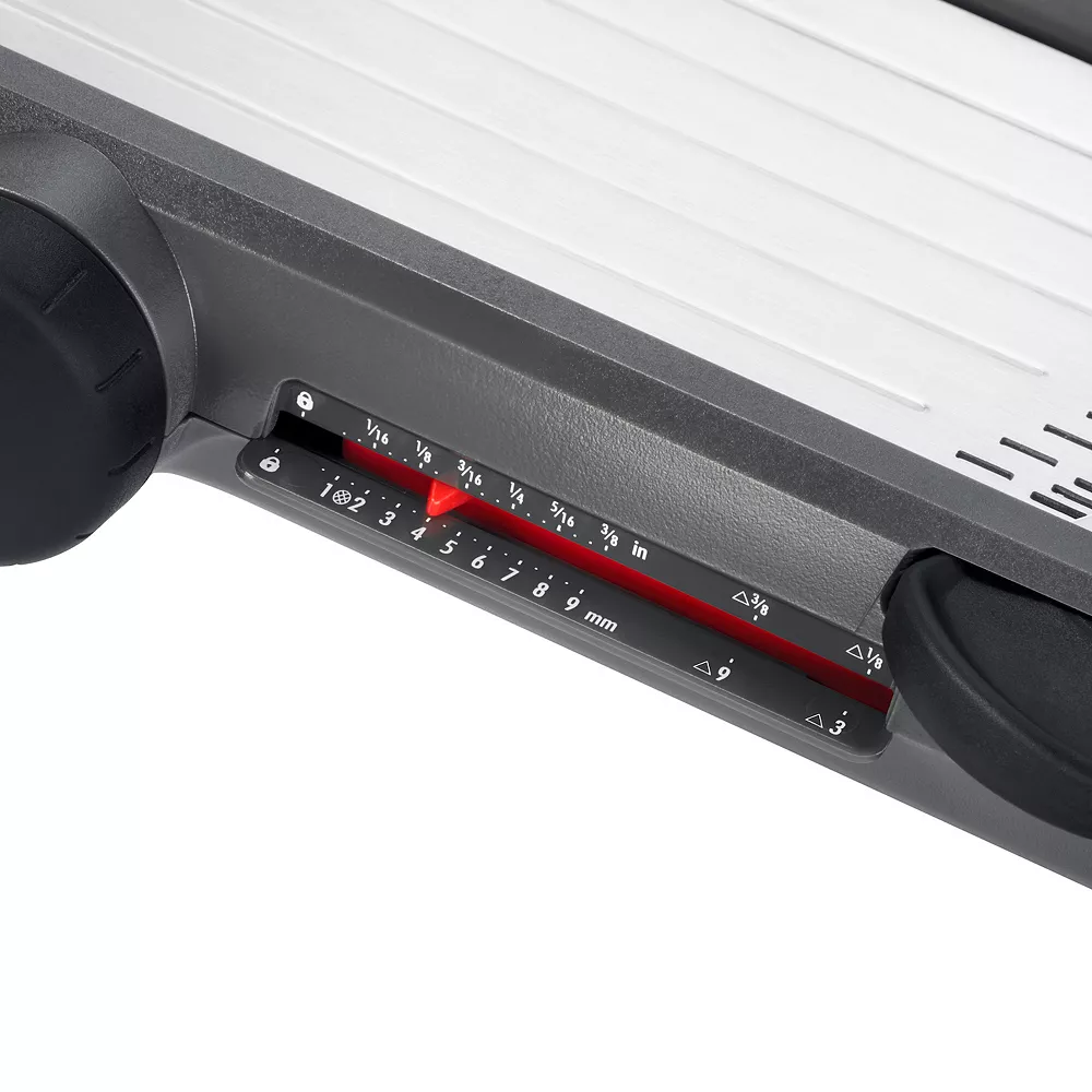 - Textured runway prevents food from sticking and parallel surfaces create even slices without wedging