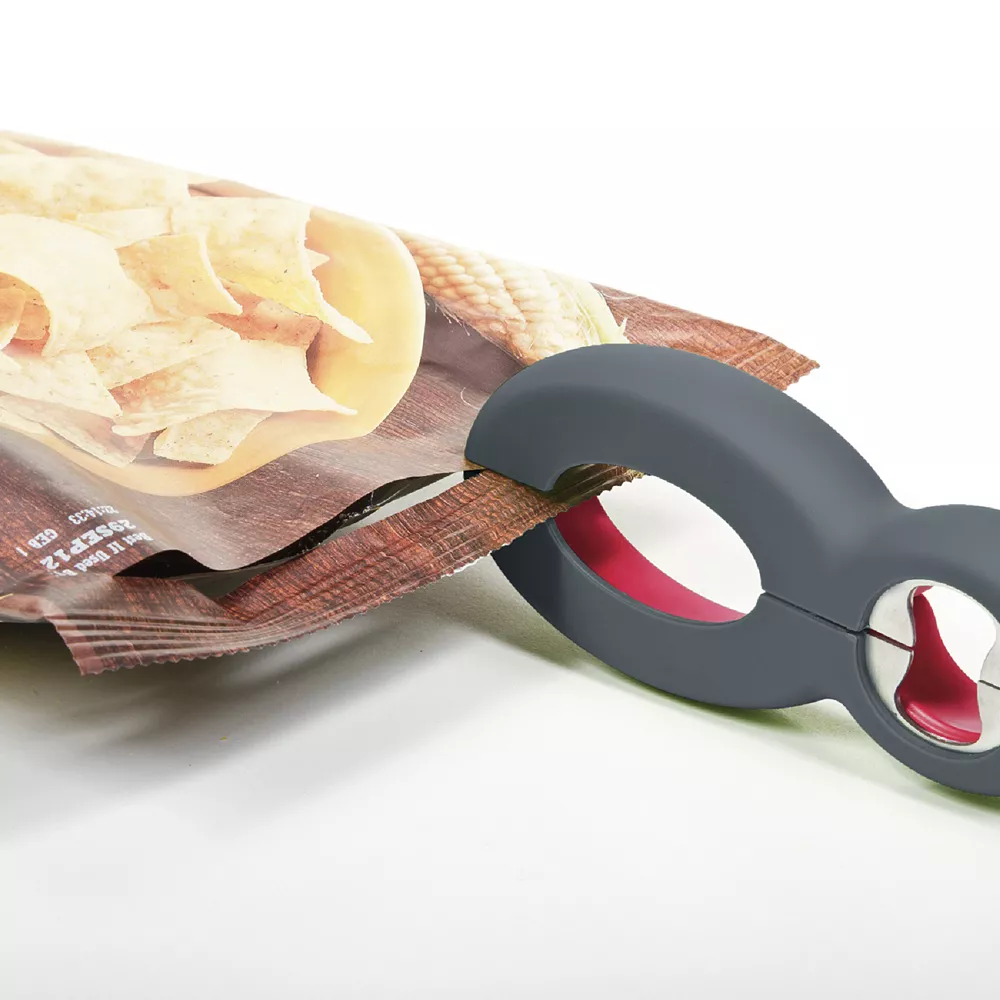 - Unique built-in blade at end of large circle slices open sealed bags, from chips to cake mixes