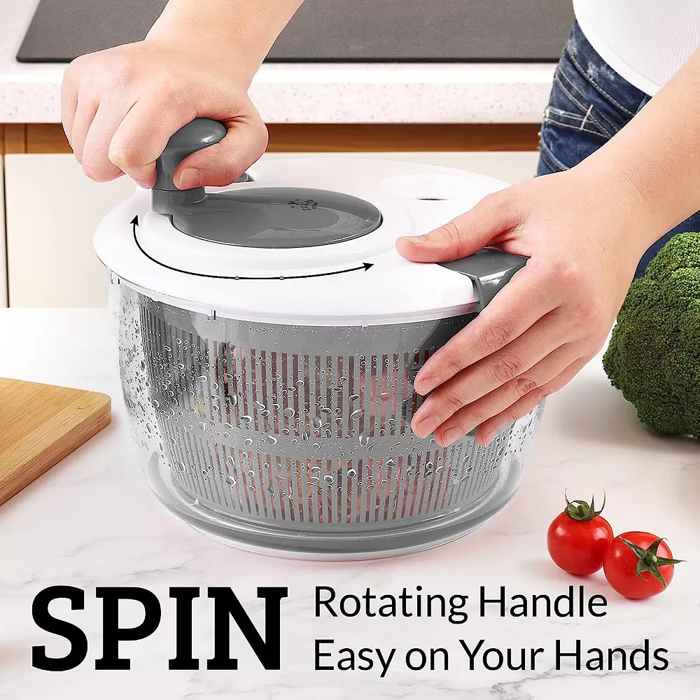 There is nothing better than a tasty salad that has a bit of a crunch! With Zulay Salad Spinner, you can now wash and spin as many times as you want until the water runs clear without sacrificing the crisp and texture of your greens. Its 5 litre outer bowl can hold 4-6 salad servings and the basket can be used as a strainer or storage for fruits and vegetables after spinning.