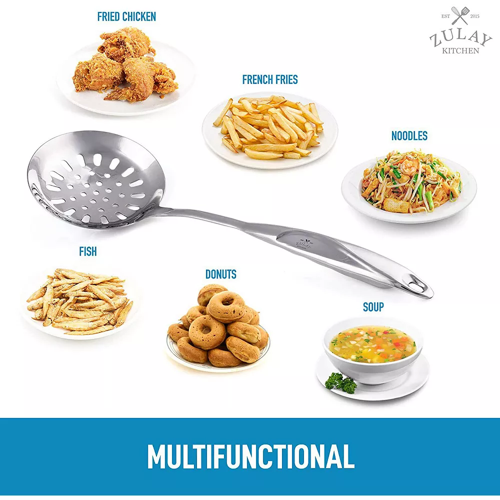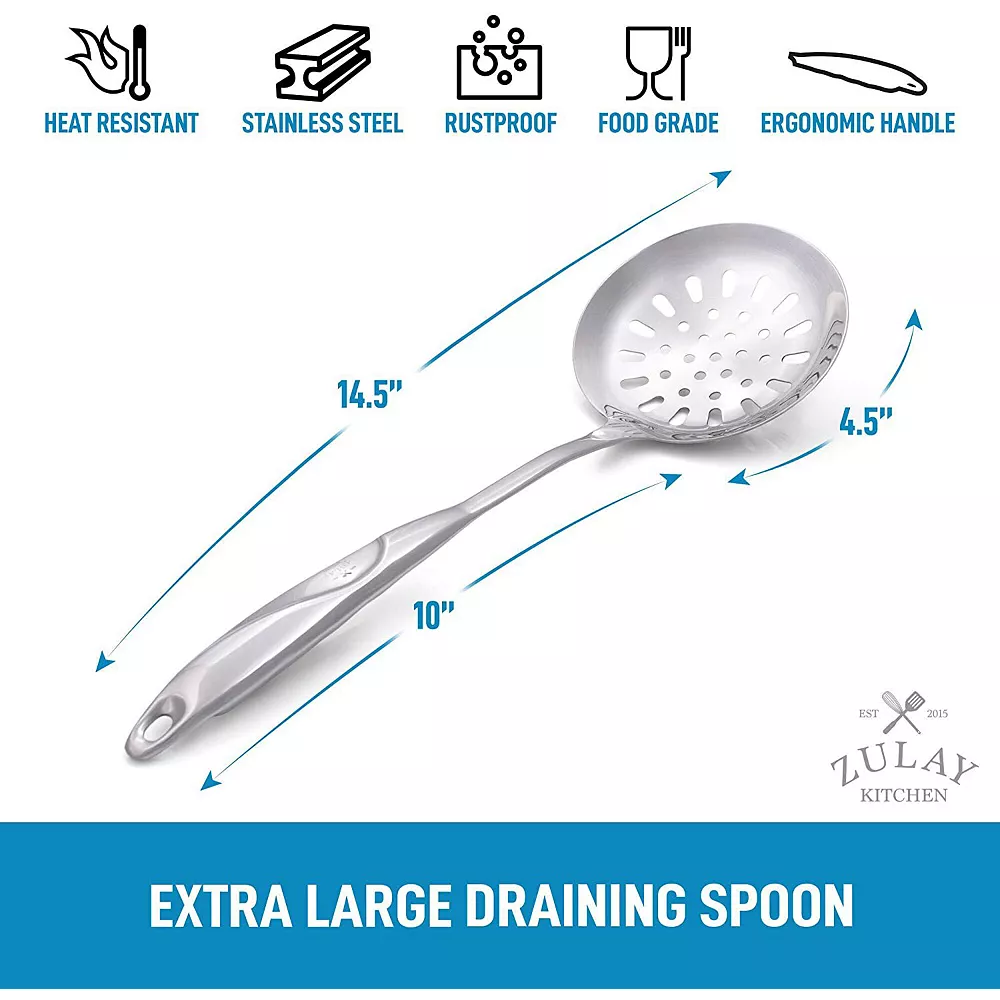 This 14.5 inch draining spoon is made from premium food grade 201 stainless steel with mirror finish. Designed to last for years of constant use and durable to withstand even the hottest temperatures making it perfect for deep frying and cooking using boiling liquids. Will not rust or corrode.