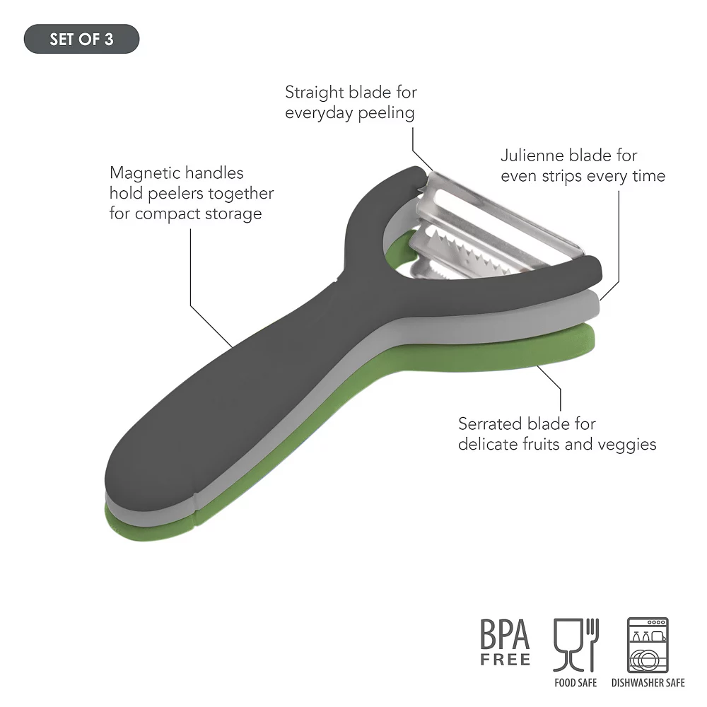 - Strong magnet in the base of each handle keeps the set of three peelers together in your kitchen drawer for compact storage.